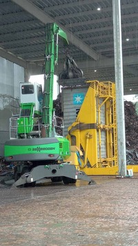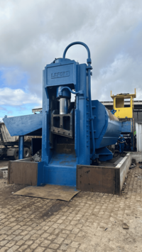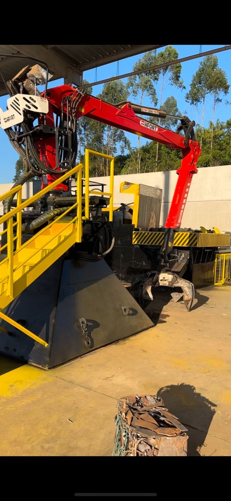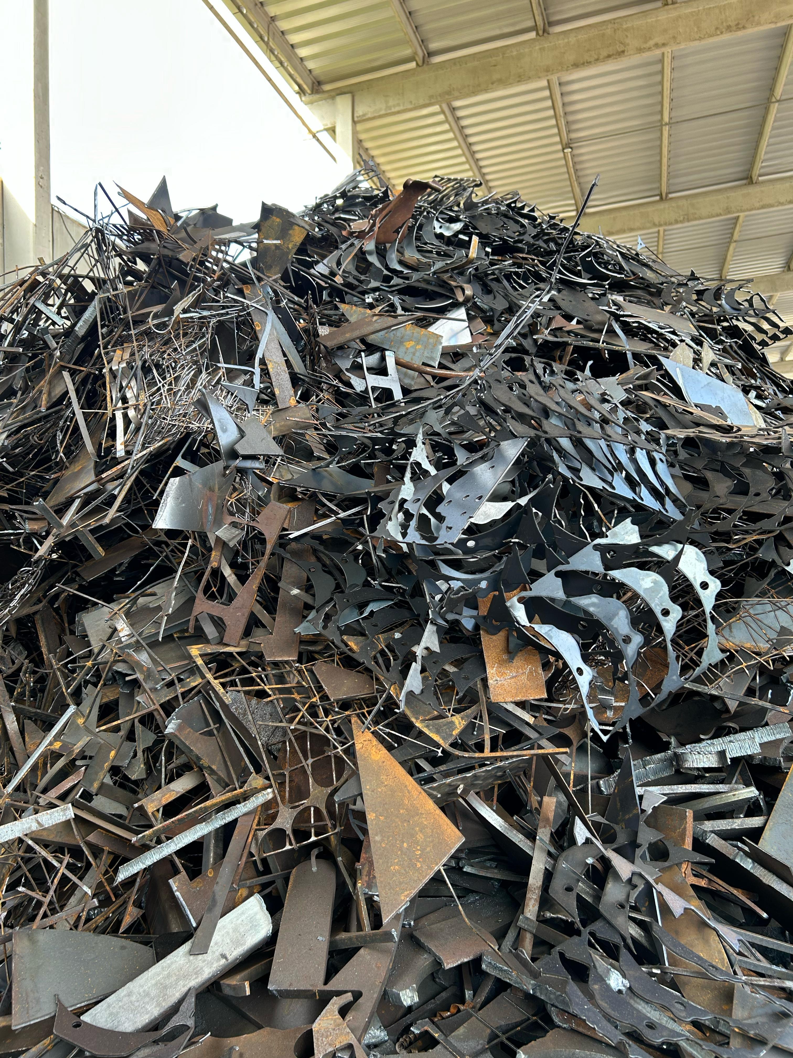 Chapas e latarias de aço cortadas por tesouras hidráulicas, prontas para reciclagem em processos siderúrgicos.